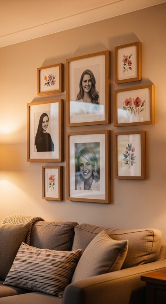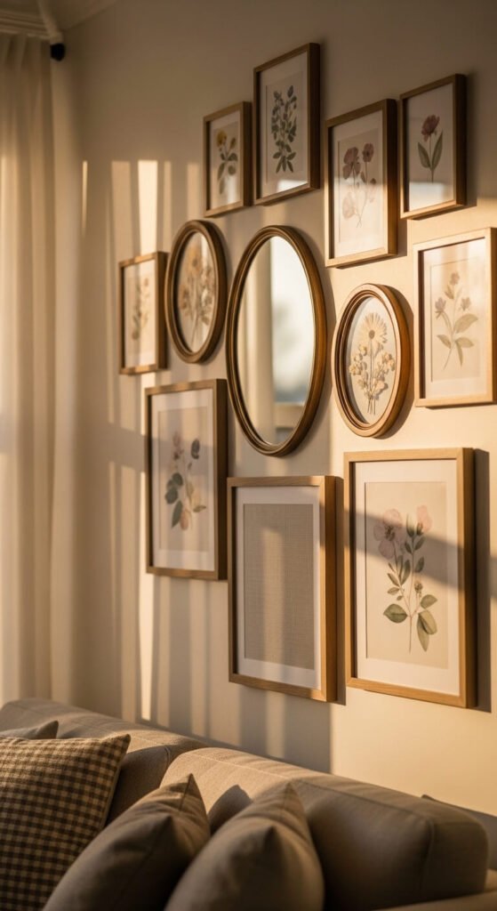 Pressed flowers are one of the most affordable gallery wall ideas out there. Pick flowers from your garden or a farmers market. Press them between heavy books for two weeks. Then frame them in matching white frames from a dollar store or thrift shop. Three frames in a row — different flowers, same frame style — creates a cohesive, organic look. It feels expensive, but it costs almost nothing. Perfect above a console table or along a narrow hallway wall.