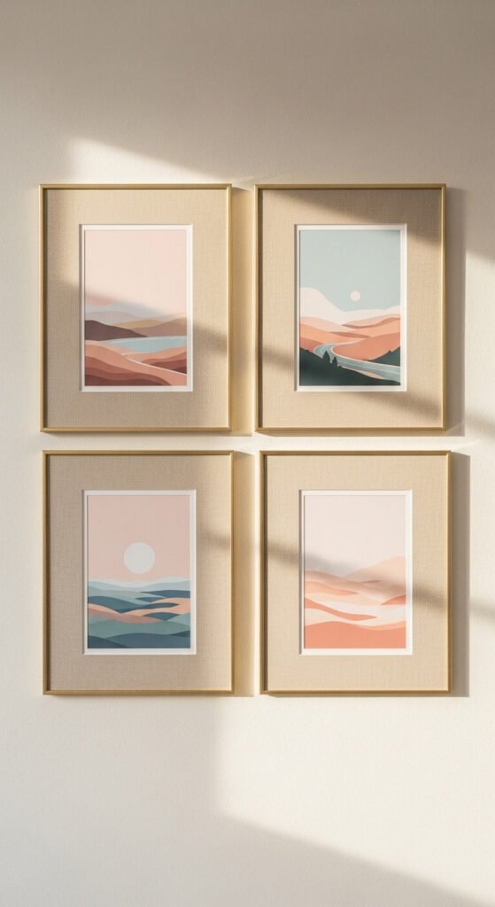 Standard white mats are fine. But linen-matted prints are something else entirely. The fabric texture adds warmth that paper can’t replicate. You can buy pre-cut linen mats at craft stores like Michaels or order custom ones on Etsy. Pair with simple thin gold frames and minimalist landscape or floral prints. The linen mat does most of the visual work. Even an ordinary print looks thoughtful and considered when it is sitting in a linen mat.