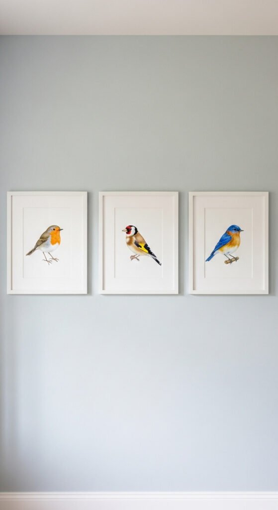 A series of matching bird prints creates a gallery wall that feels curated and collected. Watercolor robins, bluebirds, swallows, and finches all work beautifully for spring. Print them in the same size, use identical frames, and hang them in a clean horizontal row. You can purchase a full set of matching watercolor bird illustrations as a digital download on Etsy for around $5–$8. Print at home and frame for under $30 total. Simple, beautiful, done.