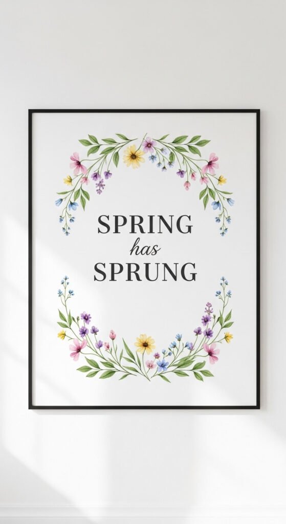One well-chosen quote print can anchor an entire gallery wall. Choose something short and seasonal — a line about warmth, growth, or light. Look for prints where the quote is surrounded by a watercolor botanical border. This gives you art and words in one piece. Use it as the centerpiece of your gallery wall and build smaller prints around it. Etsy has hundreds of downloadable spring quote prints for under $5. Print at 11×14 for real presence.