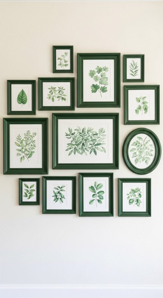 Green on green is a surprisingly sophisticated spring look. Use dark green frames with botanical prints that feature leaves, ferns, and tropical foliage in a range of green shades. The variation in tone — sage, emerald, mint — creates depth within a monochrome palette. No other colors needed. This works especially well in a home office, dining room, or any space that feels flat and needs life. The all-green palette reads as lush and intentional, not random.