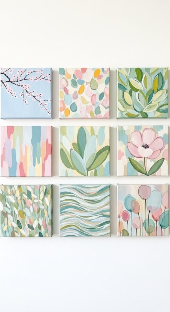 Small canvases are affordable and you do not need any talent to make them look good. Pick up a pack of 6×6 mini canvases from a craft store for a few dollars. Paint simple abstract shapes — loose circular petals, sweeping leaf strokes, blobs of color. Use only three or four colors. Let them dry and arrange in a 3×3 grid with equal spacing. This is genuinely one of the best DIY gallery walls for beginners. You made the art yourself. It looks amazing.