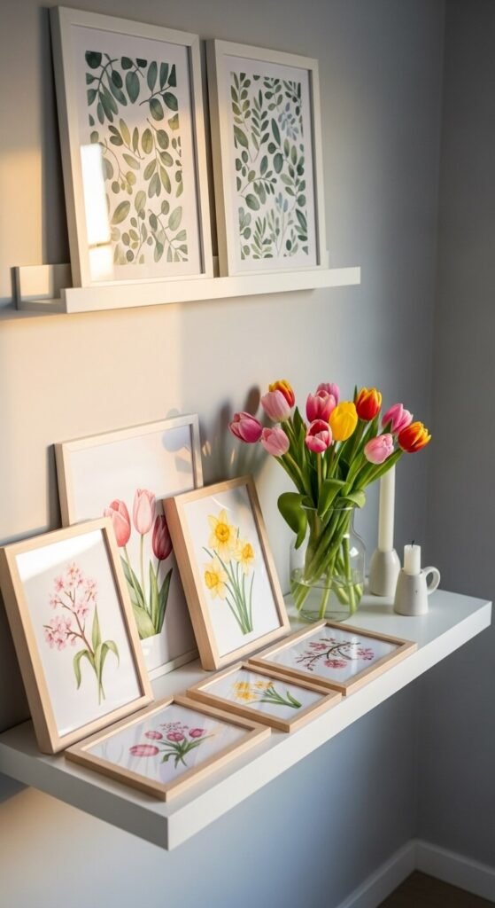 Not everything needs to be nailed up. A floating shelf below your gallery wall lets you layer framed prints at different depths. Lean some frames against the wall, hang others above. Add a small vase of fresh spring flowers, a candle, and a small ceramic object. The combination of hung art and styled shelf makes the whole thing feel lived-in and considered. Change out the flowers and shelf objects with the seasons without touching the frames.