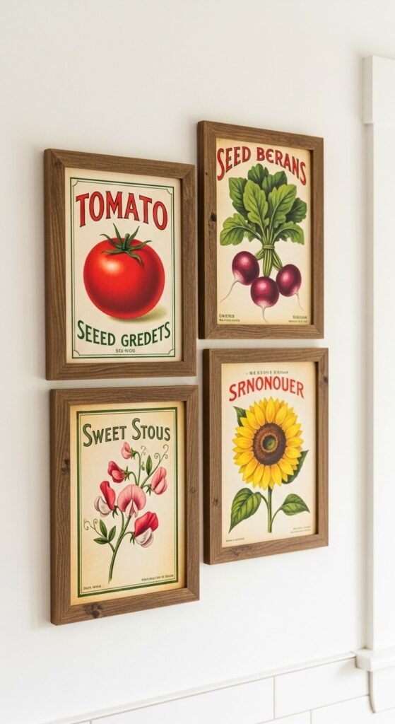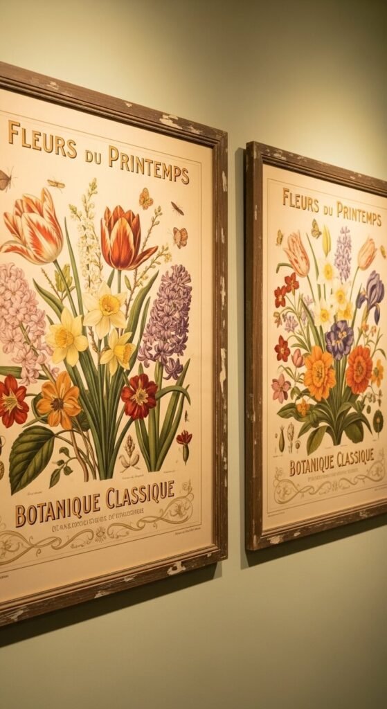 Old seed packet illustrations are charming, colorful, and practically made for spring walls. Free vintage seed packet art is widely available through public domain archives. Print them and frame in slightly worn or distressed wooden frames for an authentic feel. This works beautifully in kitchens and dining rooms. A cluster of four to six frames in a casual, relaxed arrangement — slightly imperfect spacing — looks collected and personal rather than staged.