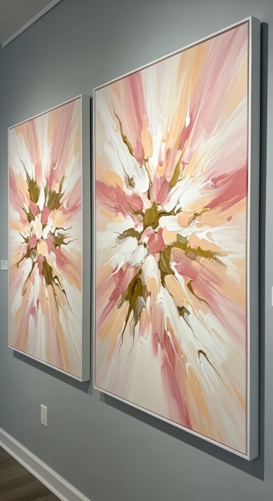 Large abstract panels make a bold statement with very little effort. You do not need to be a painter. Pour a few acrylic colors onto a canvas — blush, peach, ivory — tilt it back and forth and let the colors flow. It takes ten minutes and dries in an hour. Two or three of these hung side by side look like art you bought at a gallery. Canvases in bulk packs from Amazon or craft stores cost under $15 for a set of four.