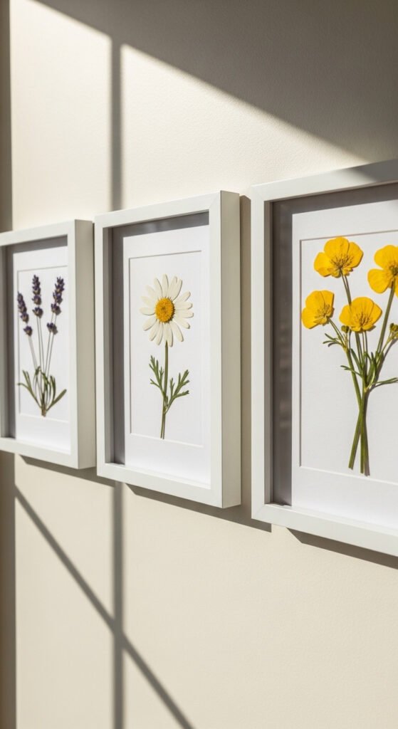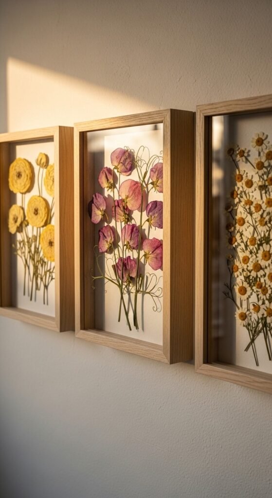 Shadow box frames have depth that standard frames don’t. That extra space lets you arrange dried flowers in three dimensions — some flat, some slightly propped. Use ranunculus, chamomile, and lavender. Dry them yourself or buy pre-dried bundles. Arrange them inside and close the frame. Three shadow boxes on a wall create a rich, textural gallery that looks like it belongs in a botanical shop or a very well-designed home. Cost: around $20–$30 total.