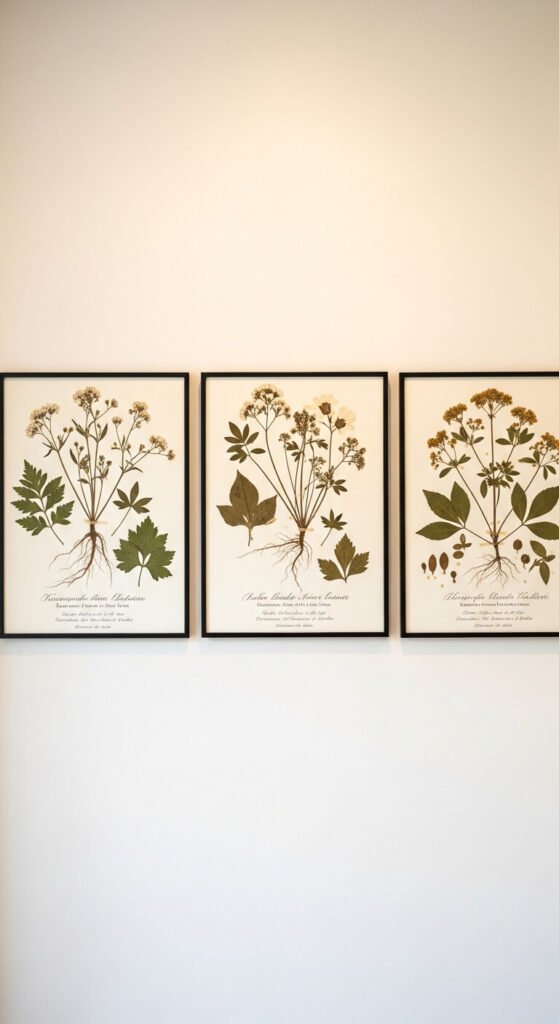 Herbarium prints are botanical art styled like scientific plant specimens — full plant from root to flower, labeled with handwritten-style text. They have a beautiful vintage-academic quality. Download free herbarium prints from museum archives or purchase from Etsy. Frame in thin black or dark green frames. A row of three looks stunning in a hallway, study, or bathroom. The clean, structured look pairs well with modern and traditional interiors alike.