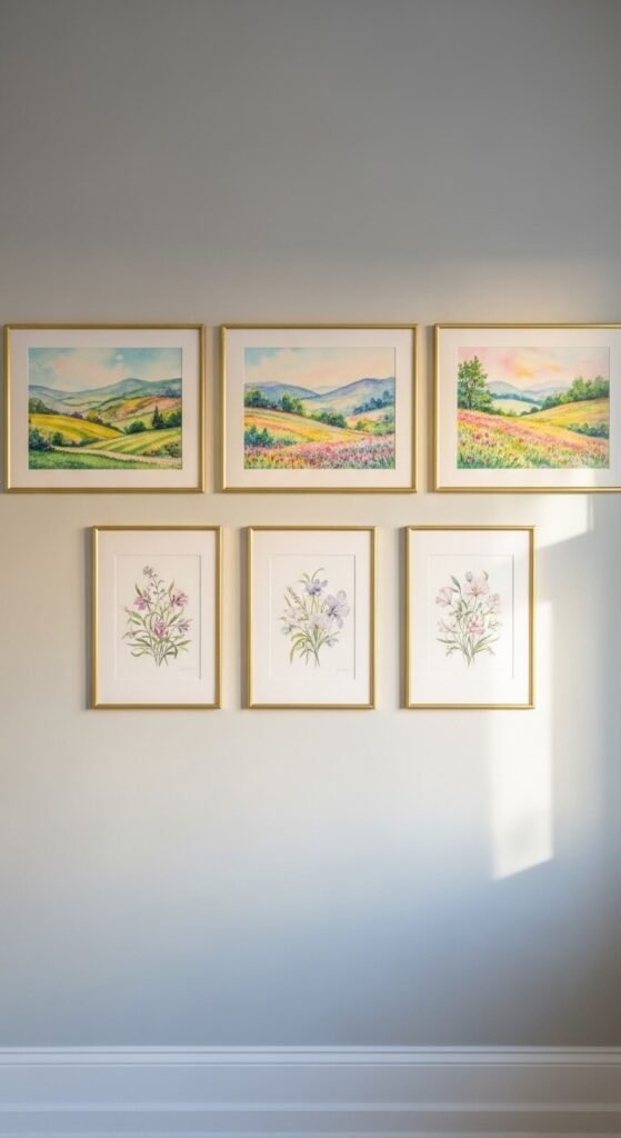 Combining landscape and floral art creates a gallery wall that feels like a full spring scene — wide open fields and close-up flowers together. Use horizontal frames for landscapes and vertical frames for florals. The different orientations add visual rhythm. Keep frames in the same finish to hold it all together. This pairing works well in living rooms and bedrooms where you want a layered, natural world feeling on the wall.