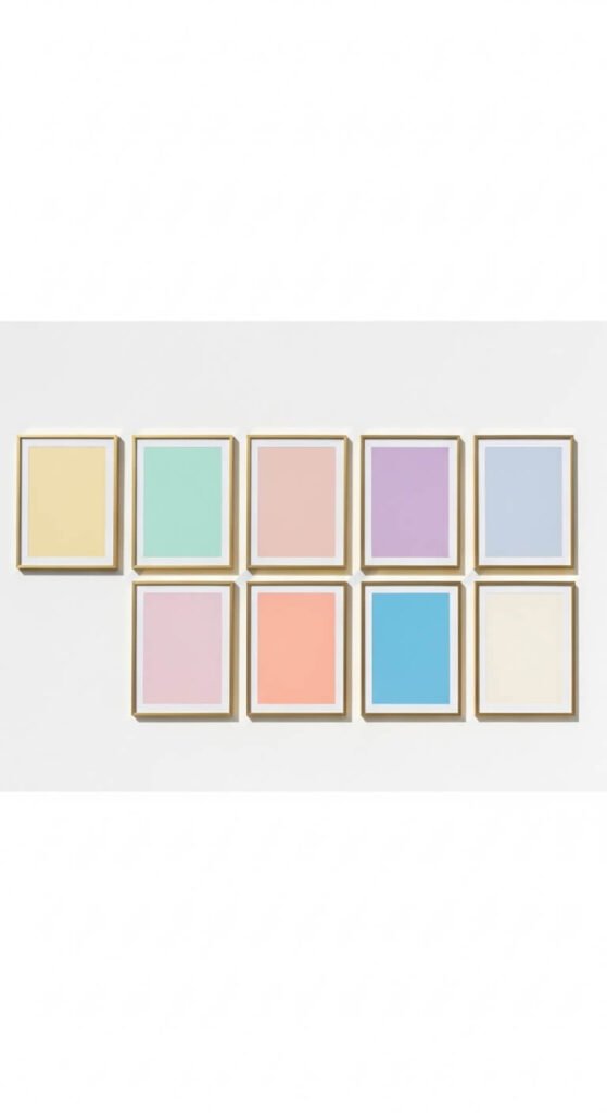 Color-blocked prints are the easiest gallery wall you can make. Print squares of solid color — each a different spring shade. Frame them all in identical small gold frames and hang in a row. That is the whole project. The beauty is in the simplicity and the color sequence. Use shades that flow naturally from one to the next — yellow into peach into blush into lavender. This works especially well in a children’s room or a playful kitchen.