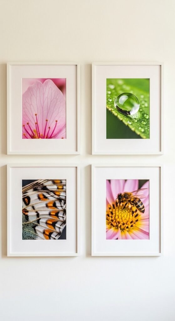 If you own a decent camera, take your own macro spring photos and print them. Cherry blossoms, dewdrops on leaves, bees on flowers — up close, these become abstract and art-like. Get them printed at a local shop or online at Walgreens or Snapfish. Frame with wide white mats for a real gallery feel. This is one of the most personal and affordable gallery walls possible. You made the art. It already has meaning.