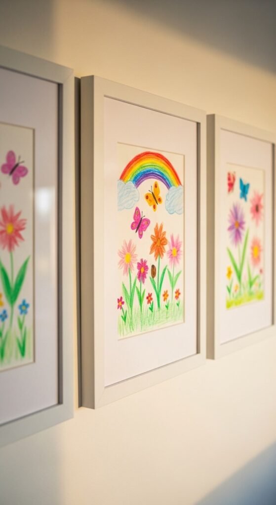 Your children’s artwork belongs on the gallery wall. Framing kids’ drawings with wide mats transforms them from refrigerator art into something that looks considered and meaningful. Use identical white frames in a small to medium size. The wide mat creates breathing room around the drawing. Three or four framed pieces together look intentional, not chaotic. Rotate them seasonally. Spring drawings — flowers, butterflies, sunshine — fit perfectly into a spring gallery wall theme.