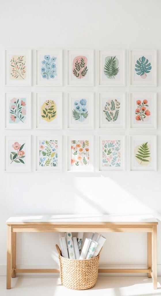 The smartest gallery wall is one designed to change with the seasons. Mount frames permanently. Then swap the prints inside rather than moving frames. Keep a basket or portfolio of seasonal art on a nearby shelf. Spring prints go in March. Swap to warm harvest colors in October. Replace with cozy wintery tones in December. You only spend money once on the frames. The art can be printed at home for under $1 per sheet. This approach makes the wall feel alive all year.