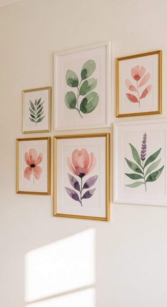 You do not need to paint these yourself. Free printable watercolor botanicals are all over Pinterest and Etsy. Print them at home on cardstock or at a local print shop for under a dollar each. Use a mix of 4×6, 5×7, and 8×10 frames to create visual variety. The key is sticking to one color palette — blush, sage, and ivory always work for spring. Hang the largest frame first, then build out from there.