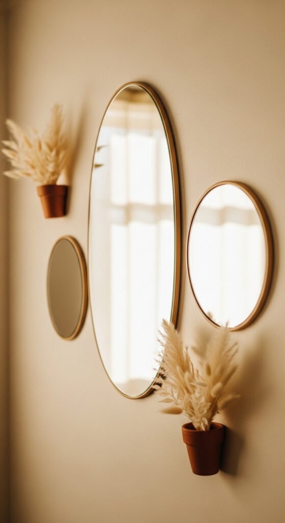 Oval mirrors add softness that rectangular frames can’t. Group two or three ovals in different sizes and hang them close together. Add a small dried pampas arrangement on a shelf below or mount a terracotta wall pocket nearby. The combination of reflective and organic textures is what makes this work. You can find affordable oval mirrors at HomeGoods, IKEA, or even Facebook Marketplace. The pampas bundles from craft stores cost around $8 and last for years.
