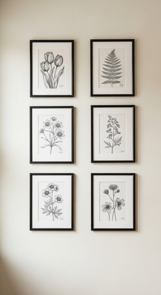 Black-and-white botanical sketches never go out of style. They feel like something you’d find in a vintage European greenhouse. Download free line-art botanical prints from sites like Unsplash or Rawpixel. Print them and frame in thin black frames. A grid of six identical frames in two rows looks polished and very intentional. This works especially well in kitchens, bathrooms, or dining rooms where you want something clean and classic.