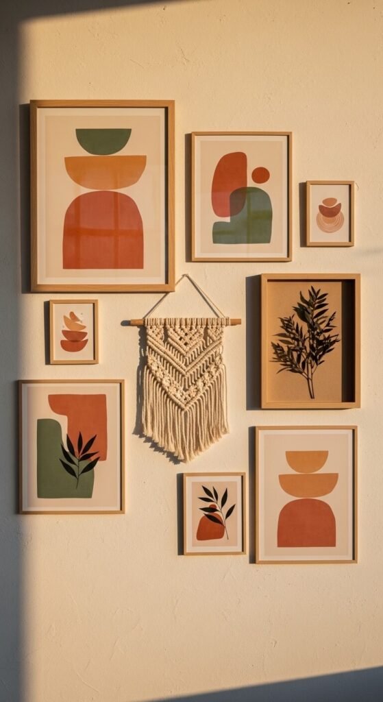 Pick three colors and commit. Terracotta, sage, and warm cream create a spring palette that feels grounded and earthy without being cold. Mix abstract prints, a small textile piece like a woven wall hanging, and a framed dried botanical for texture variety. You do not need every piece to match exactly. The color story does the cohesion work for you. Look for small abstract art prints on Etsy shops that sell digital downloads — most are $3–$5.