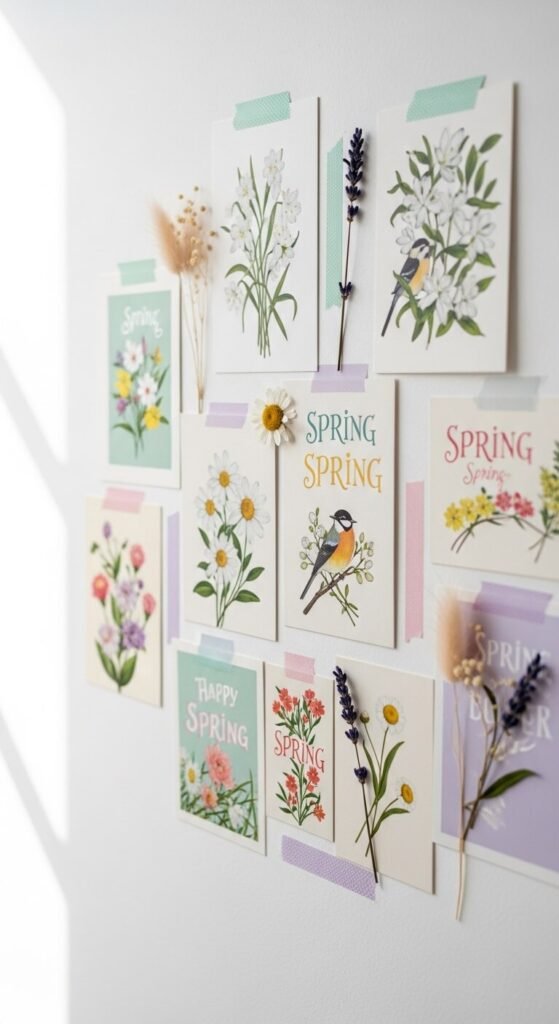 No frames needed here. Washi tape postcards are perfect for renters or anyone who doesn’t want to commit to nails. Collect spring-themed postcards from stationery shops, markets, or print your own. Arrange them in a loose cluster on the wall using pastel washi tape at the corners. Tuck in small dried flower stems or a sprig of eucalyptus between cards for a layered, collected look. This entire wall can be assembled for under $15.