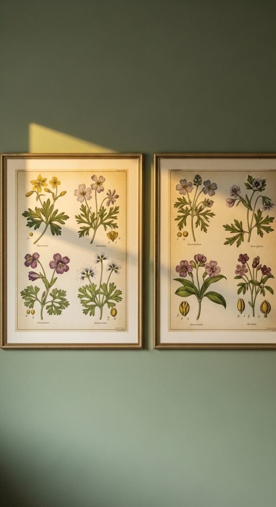 Old botanical maps with detailed hand-drawn illustrations and Latin plant names have a beautiful, intellectual quality. You can find free vintage botanical prints through The British Library’s public domain archive or sites like Reusable Art. Print them large — an 11×14 or even 16×20 — for real impact. Frame in aged gold or dark wood. Two prints side by side on a sage green wall is a complete, finished look that requires almost no effort.