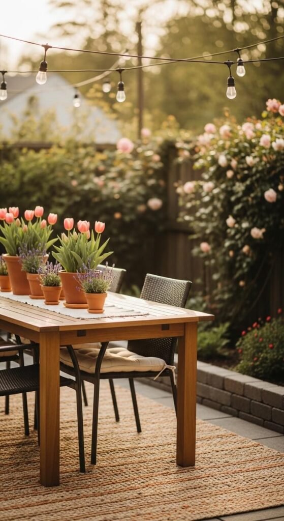 Style it simply: one small pot of bright flowers, a candle in a glass jar, a folded cloth napkin. That’s it. The simplicity is the point. You’re not decorating a magazine spread — you’re creating a place to drink your morning coffee outside.