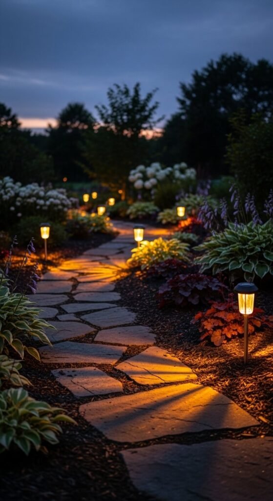 A set of 8–12 lights typically costs $15–25. Push them into the soil along a garden path, driveway edge, or the border of a patio. No wiring, no electrician, no hassle.