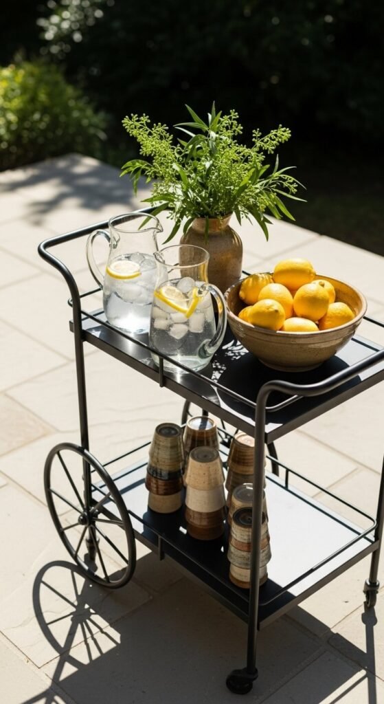 An outdoor bar or drinks cart adds function and a relaxed, gathered-friends feel.