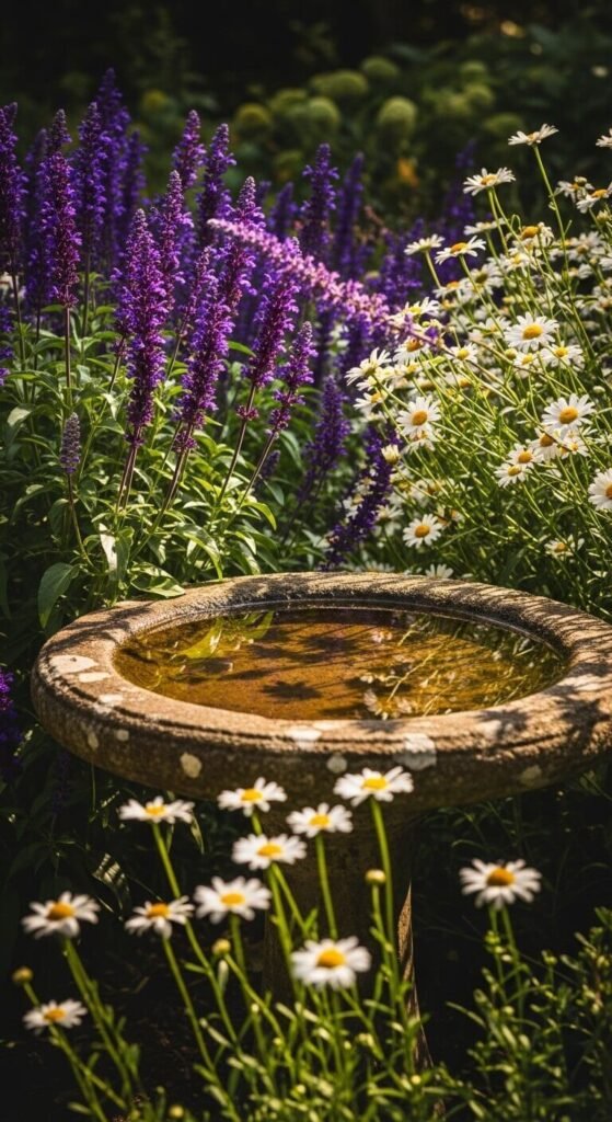 Surround the base with low flowers like salvia, alyssum, or creeping thyme to make it look intentional rather than dropped in. Refill it every couple of days to keep birds coming back.