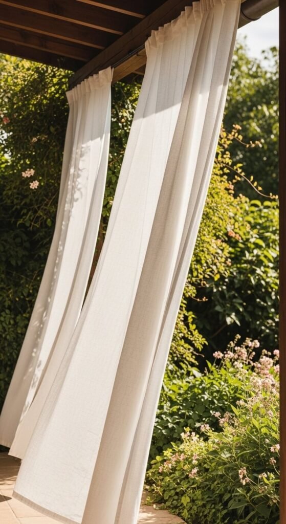 Install a tension rod or curtain wire between posts or pergola beams. Hang weather-resistant fabric panels in white, cream, or a soft stripe. IKEA sells basic outdoor curtain panels at very low prices.