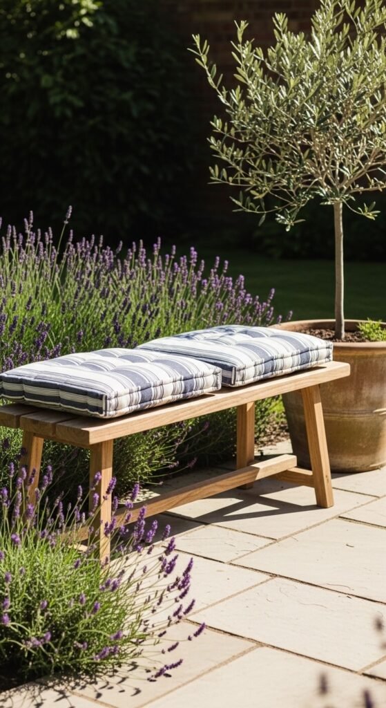 Place a wooden bench against a fence, along a garden path, or at the edge of a patio. Add weather-resistant seat cushions in a bold pattern — stripes, checks, or botanical prints work well outdoors.