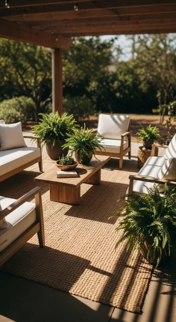 An outdoor rug is the fastest way to define a space. It signals “this area is for living,” not just walking through.