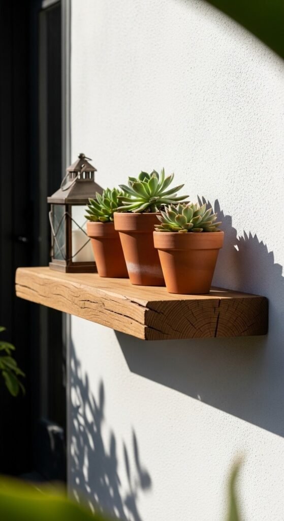 Style it with a few small plants, a lantern, and maybe a small framed chalkboard with a seasonal greeting. This works especially well in covered porch areas where direct rain won’t hit the shelf constantly.