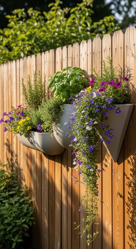 This turns a blank fence into a living display. Use stainless steel screws or outdoor-rated hooks to prevent rust staining on the wood. Rearrange the layout seasonally to keep things looking new without spending more.