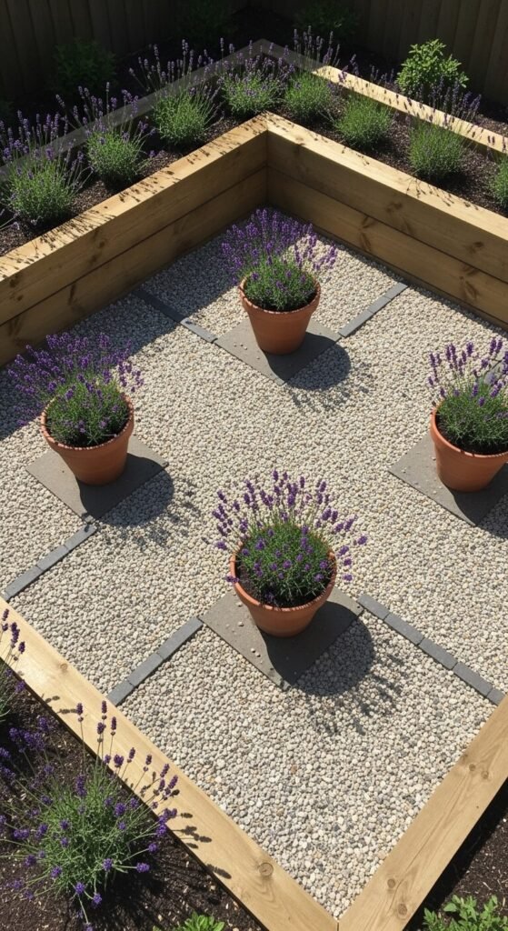 Add edging with wooden boards, bricks, or steel landscape edging to keep the gravel contained. Place furniture directly on top. It drains well, stays low maintenance, and looks clean and intentional.