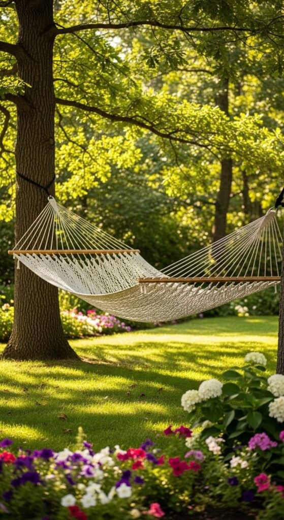 No trees? A freestanding hammock stand runs about $60–80 and can be placed anywhere on the lawn. Pair it with a small side table and it becomes a full outdoor lounge setup.