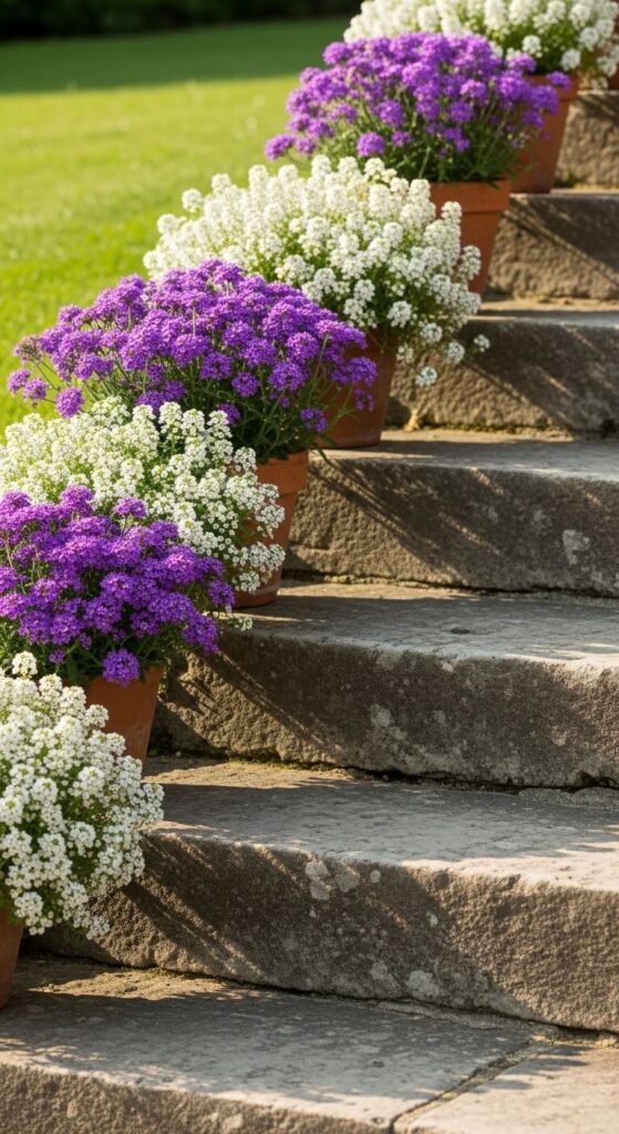 Choose low, mounding plants so they don’t block foot traffic — alyssum, verbena, pansies, or compact marigolds all work well. Terracotta pots in a uniform size keep it looking tidy rather than cluttered.
