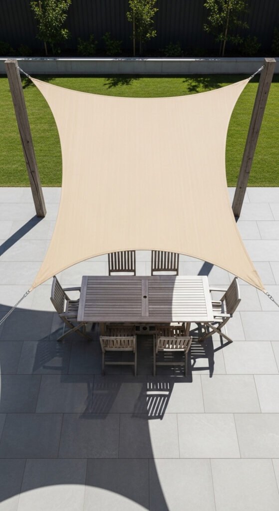 A triangular shade sail installs in a few hours using posts, turnbuckles, and heavy-duty anchors. They cost $30–80 depending on size and are available in every color imaginable.