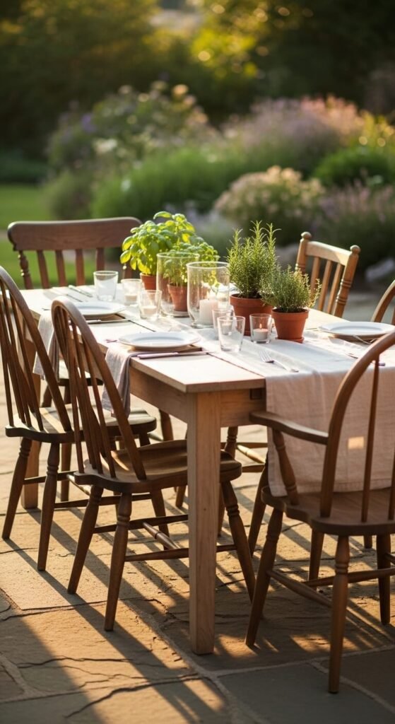 You don’t need a matching set. Mix wooden chairs with a farmhouse table for a relaxed, collected look. A linen table runner, a few small herb pots, and glass candleholders dress it up without much effort or cost.