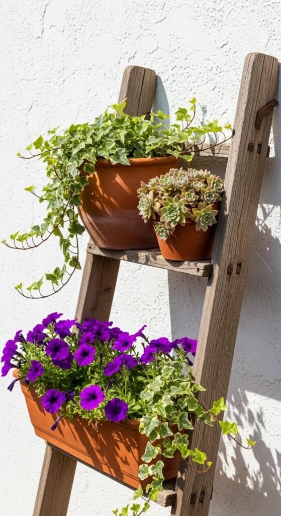 Place small pots on each rung. Mix trailing plants with upright ones for visual variety. The whole project can cost under $15 if you already own basic tools.