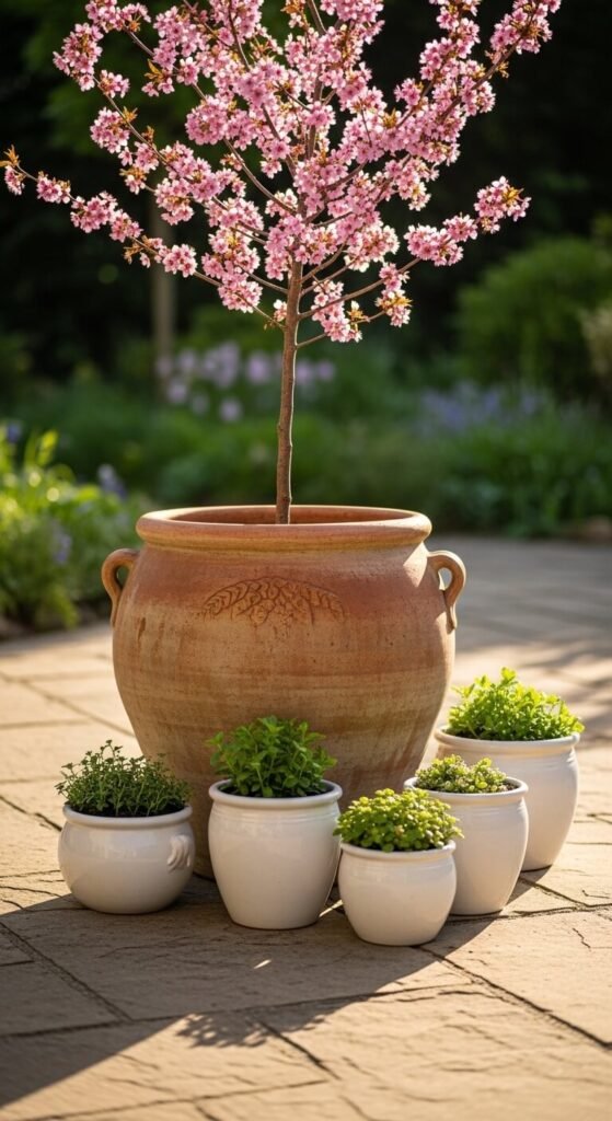 You don’t need a fancy statement pot. A large terracotta urn or a wooden half-barrel works beautifully. Plant something with height — a small ornamental tree, tall grasses, or a climbing vine trained around a stake.
