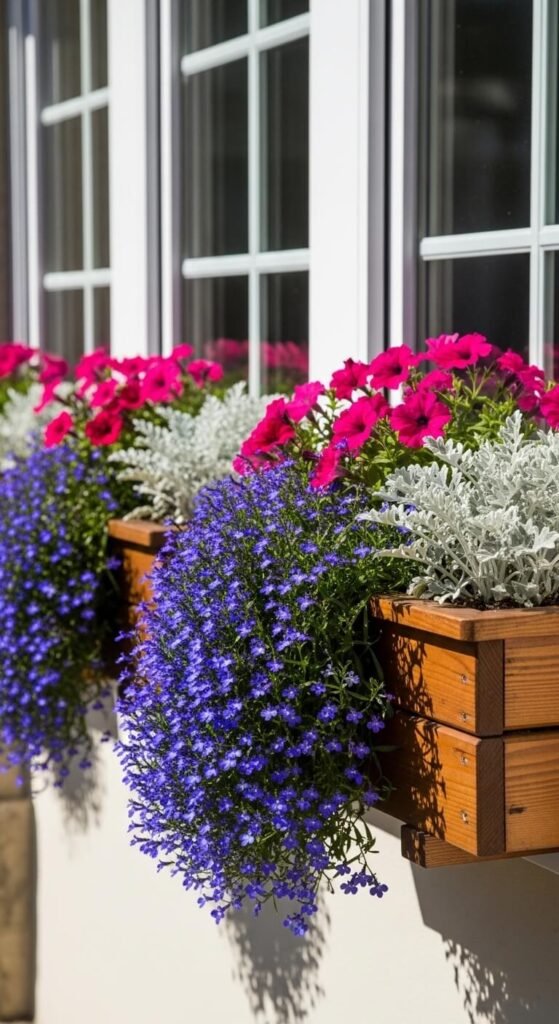 Mount them under windows or along a deck railing. Fill them with a thriller, filler, and spiller combo — one tall plant, one bushy plant, one trailing plant. This formula creates full, professional-looking arrangements.