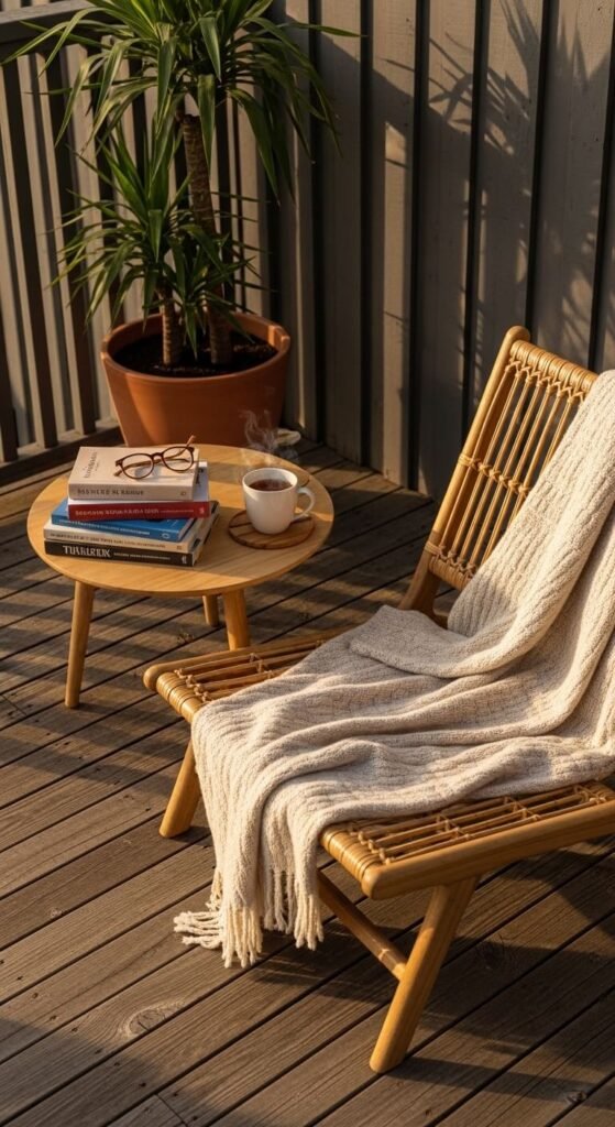 A comfortable chair, a small side table, and some shade are all you need. Add a weather-resistant throw blanket for cool evenings. A tall potted plant beside the chair adds a sense of enclosure without walls.