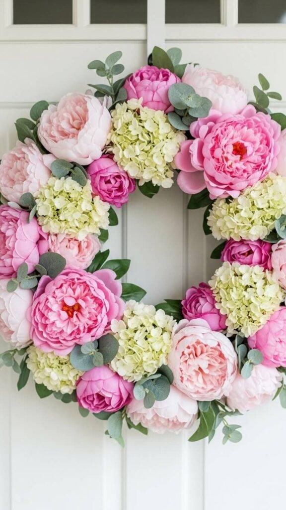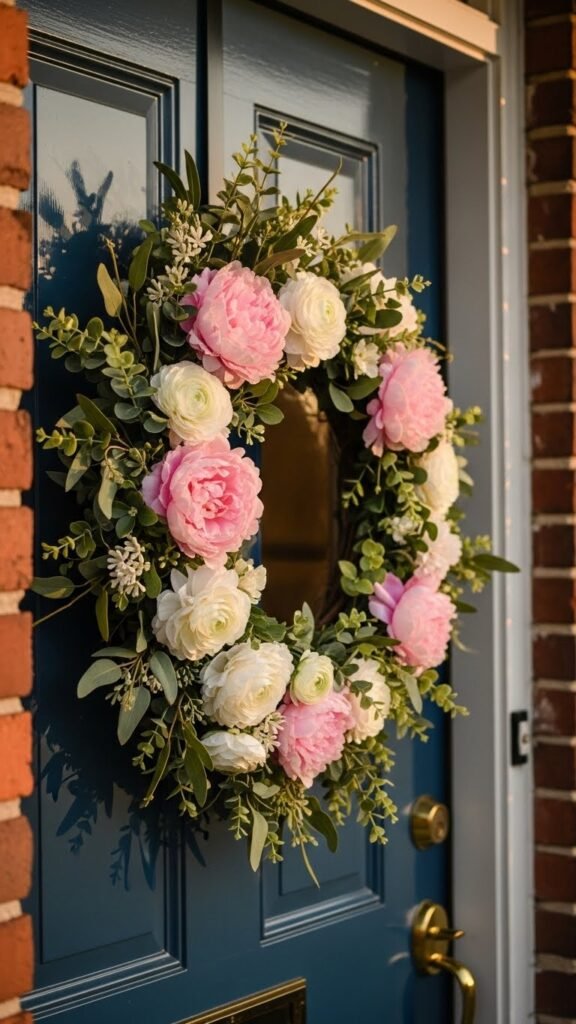 Peonies scream spring luxury without the florist price tag. Buy faux stems from craft stores during 40% off sales—they look real from three feet away. Wire them onto a grapevine base in clusters, leaving gaps for eucalyptus to peek through. This combo works on any door color and lasts all season without wilting. Swap peonies for garden roses if you want a tighter budget. Total cost: under $25 if you shop smart.