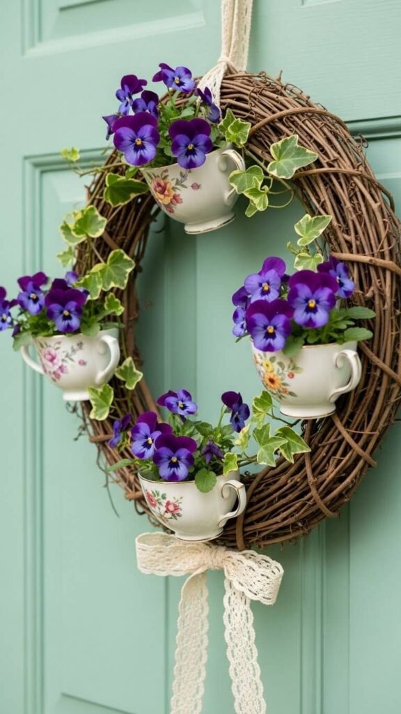 Raid thrift stores for mismatched teacups—chipped ones work fine. Wire them securely to a grapevine wreath so they sit upright. Fill with faux or real flowers and let some greenery spill over the edges. This shabby chic look costs $8-10 if you already have the base. Swap out blooms monthly to keep it interesting. Pairs perfectly with cottage or vintage farmhouse exteriors.