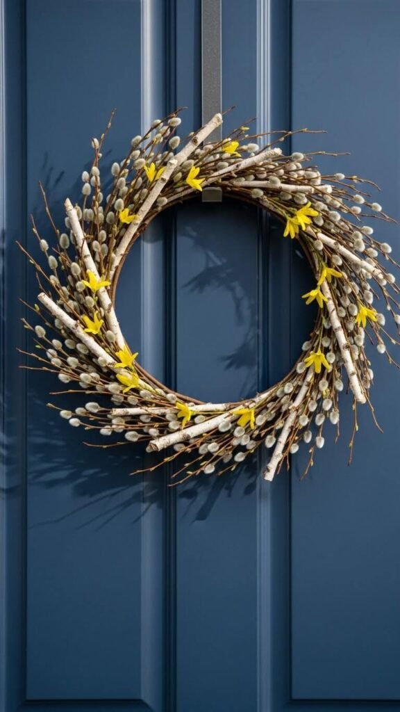 Pussy willows signal early spring better than anything. Bend fresh or faux branches into a circle and secure with wire. The soft catkins add texture without busy florals. Tuck in forsythia or other early bloomers for color pops. This takes 20 minutes and costs under $10. Dry the willows by hanging upside down if you want them to last. Perfect for doors that face harsh sun.