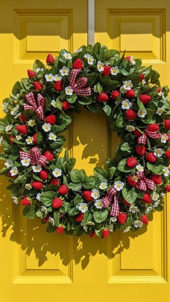Go fruity for a playful twist. Wire strawberry picks around a foam base—craft stores stock them in spring. Mix in white flowers and green leaves to balance the red. This screams backyard picnic vibes and makes kids smile. Costs $12-18 and takes 45 minutes. Works great for kitchen doors or homes with red accents.