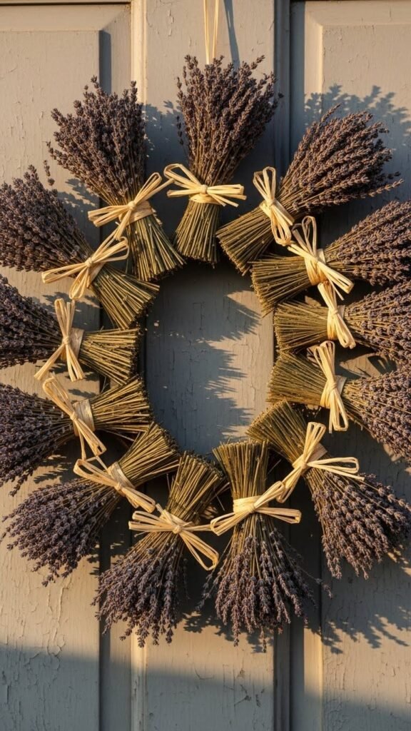 Dried lavender lasts forever and smells divine. Buy bundles or dry your own by hanging fresh lavender upside down for two weeks. Tie small bunches with twine and attach them to a wire frame in overlapping layers. The loose, organic shape feels effortless. This runs $15-20 and transitions beautifully into summer. Bonus: it repels bugs naturally.