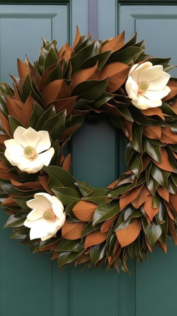 Magnolia leaves bring Southern charm north. Layer preserved or faux leaves on a wire base, overlapping like shingles. The glossy texture catches light beautifully. Add a few faux magnolia blooms for softness. This sophisticated look works on formal entryways and costs $25-35 for quality materials. Lasts multiple seasons if stored properly.