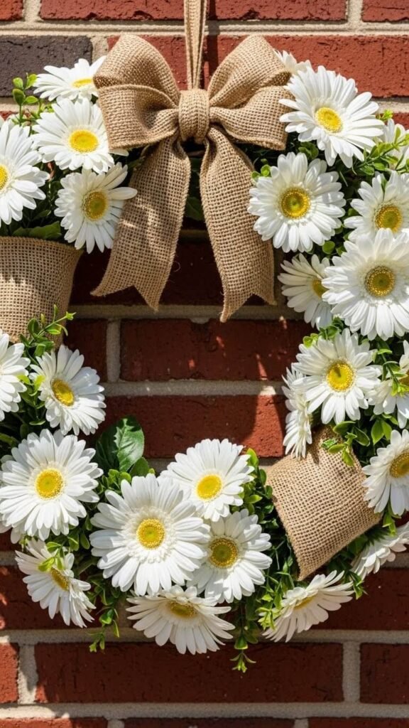 Daisies keep things casual and happy. Wire white or yellow daisy stems onto a grapevine base in random clusters. Wrap sections with burlap ribbon for rustic texture. This no-fuss design costs under $20 and takes 30 minutes. Great for covered porches or doors that need low-maintenance decor. Swap daisies for sunflowers in late spring.