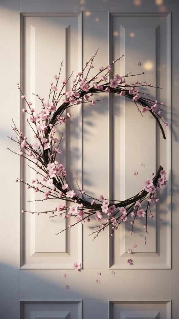Cherry blossoms bloom briefly but make a statement. Arrange faux branches in an asymmetric crescent rather than a full circle—it feels more artistic. Secure with floral wire at key points. This modern take costs $15-20 and suits minimalist homes. The open design won’t overwhelm small doors.