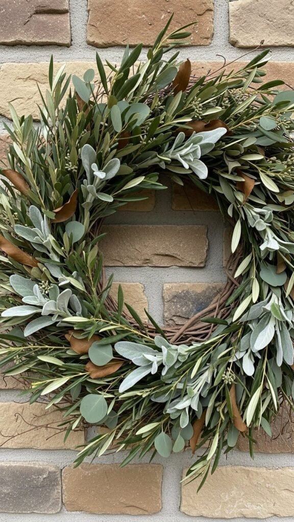 Sometimes greenery alone is enough. Start with a grapevine base and tuck in fresh or faux eucalyptus, olive branches, and lamb’s ear. No flowers needed—the mixed textures create interest. This timeless look costs $12-18 and never goes out of style. Refresh greenery as it dries for evolving texture.