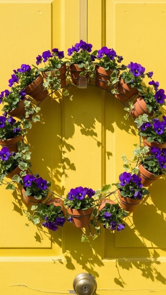 Think outside the wreath. Wire small terra cotta pots to a metal frame and fill with spring annuals like violas or pansies. This living wreath needs weekly watering but stays colorful for months. Costs $15-20 and makes a unique statement. Works best on covered porches away from harsh elements.